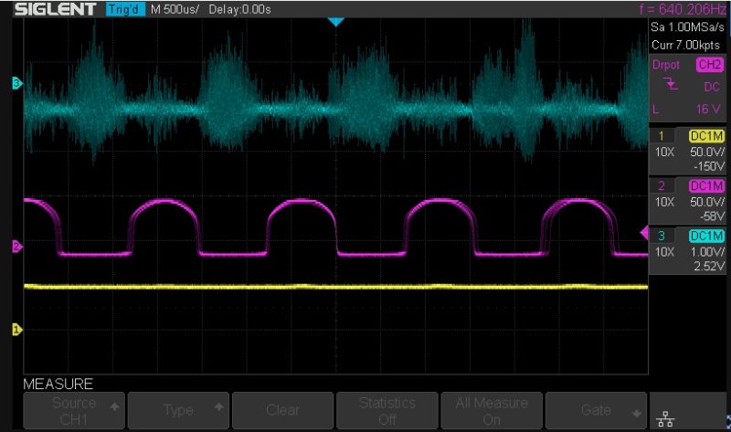 Blauw = het signaal op de 2,2 Ohm weerstand