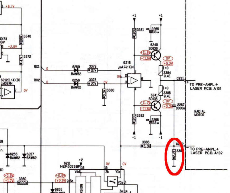 de “geitenbaardjes” die je ziet zijn correctiesignalen voor de radiaalservo voor de spoorvolging. Deze ontstaan tijdens het opstarten om de excentriciteit van de CD te compenseren. Deze “geitenbaardjes” moet je tijdens het afspelen dus ook aan de “lage” kant van 2267 (-) terugvinden. Tot hier toe kan ik nog geen werkelijke elektrische fout ontdekken, maar de vraag is wel, waarom het loopwerk zo paniekachtig op een klapje van buitenaf reageert. Op afstand bekeken, zou ik bij het loopwerk zelf en de ophanging daarvan beginnen om de fout te vinden.”