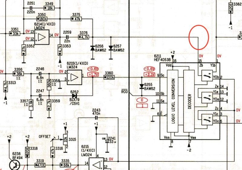 Ik vraag me wel af uit welke richting de storing komt. Je meet voor de schakelaar, de storing kan ook van de radial servo schakeling af komen. Zo een schakelaar (4053) is niet kritisch in de signaalrichting.